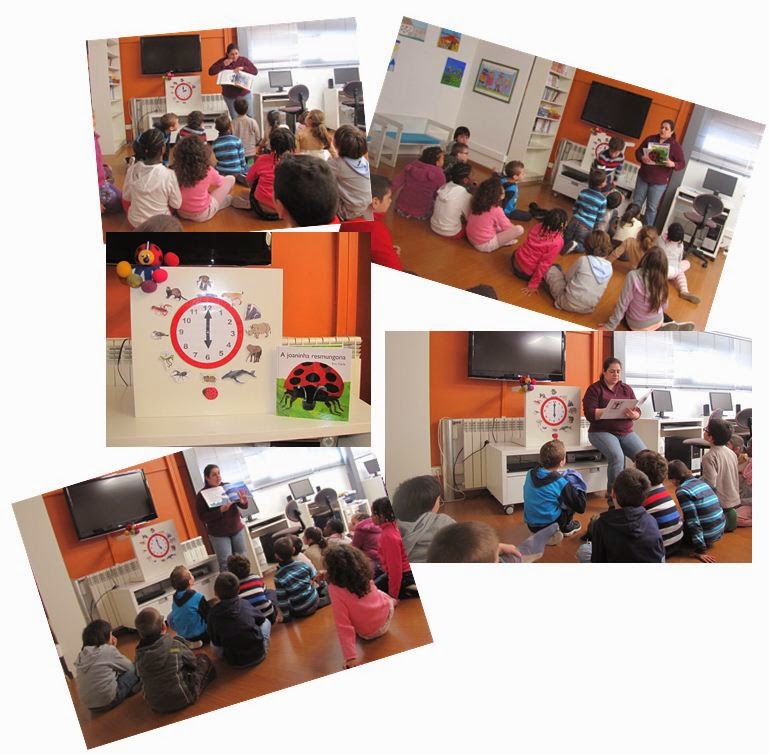 O nosso 2º ano estava a trabalhar as horas e convidamos a Joaninha Resmungona para nos contar a sua aventura e nós ajudar a aprender e a trabalhar a noção de horas, minutos, quarto de hora e meia hora.